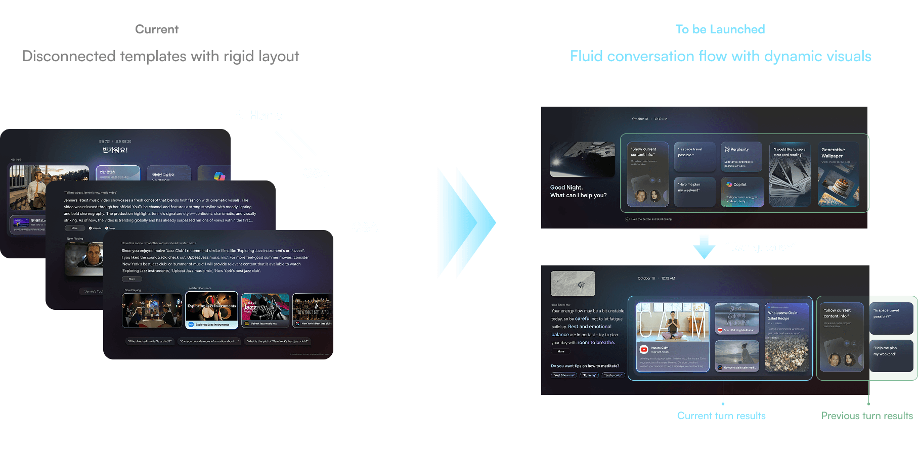 Dynamic visual layout: moving away from static, text-heavy responses toward visually engaging UI on a large screen