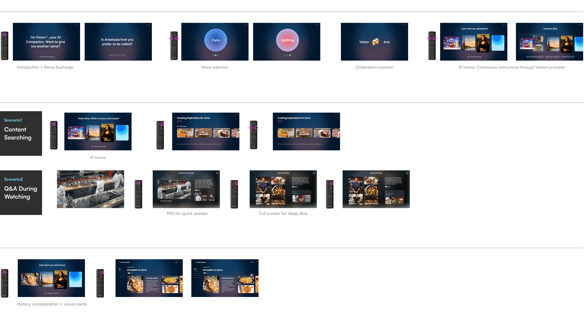 I led the core UX design and partnered with a visual designer to build several fast, visually expressive vision experiences — a voice-first, hands-free companion designed to feel effortless and human. In just three weeks, we brought six core scenarios to life: three enhancing familiar TV moments (onboarding, recommendations, and watching content), and three expanding what AI could enable (small talk, travel companion, and memory).