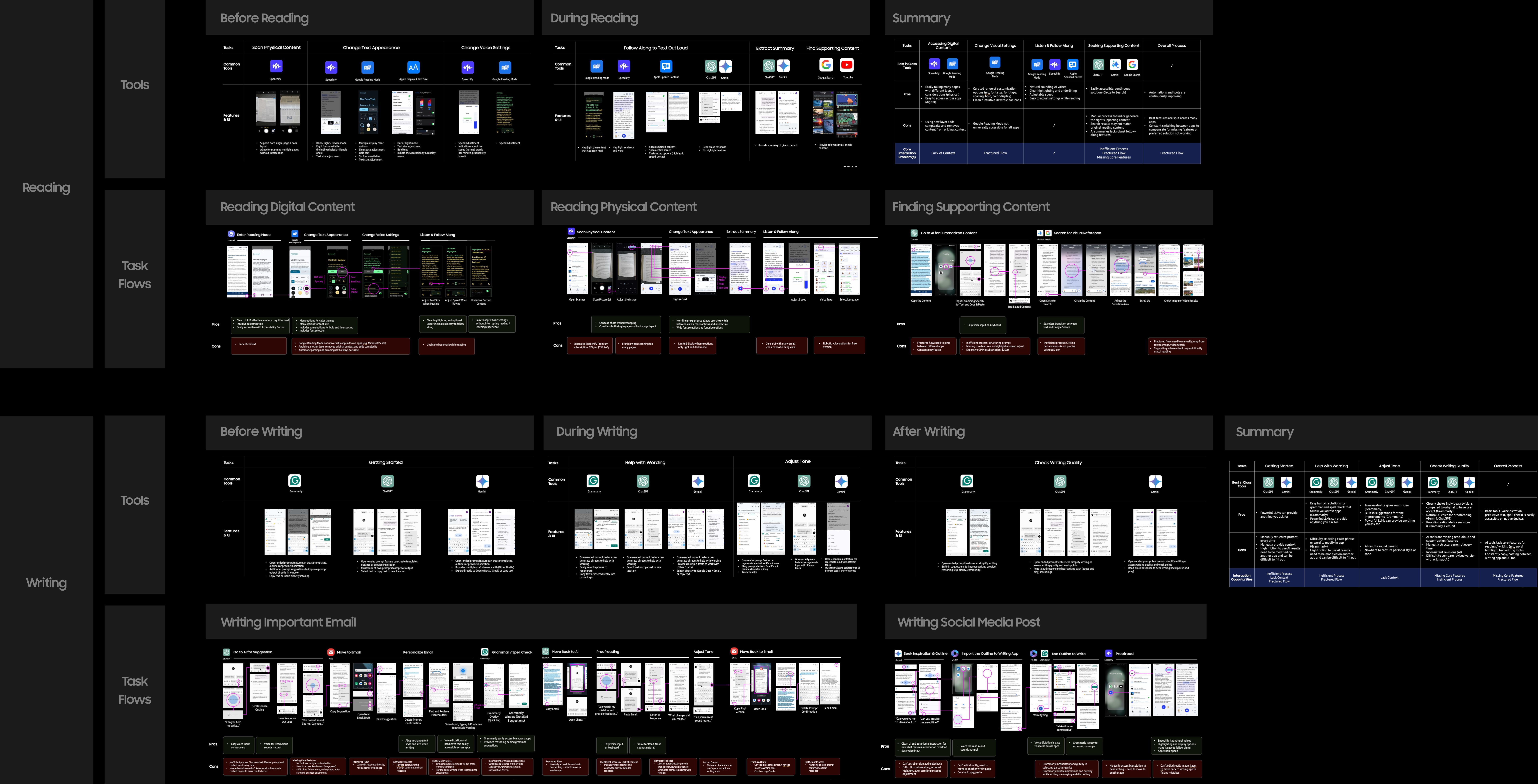 Next, we studied how dyslexic users interact with mainstream reading and writing tools in their workflows. Many tools offer isolated assistance, but consistently fail to support the entire journey from understanding to expression to action.