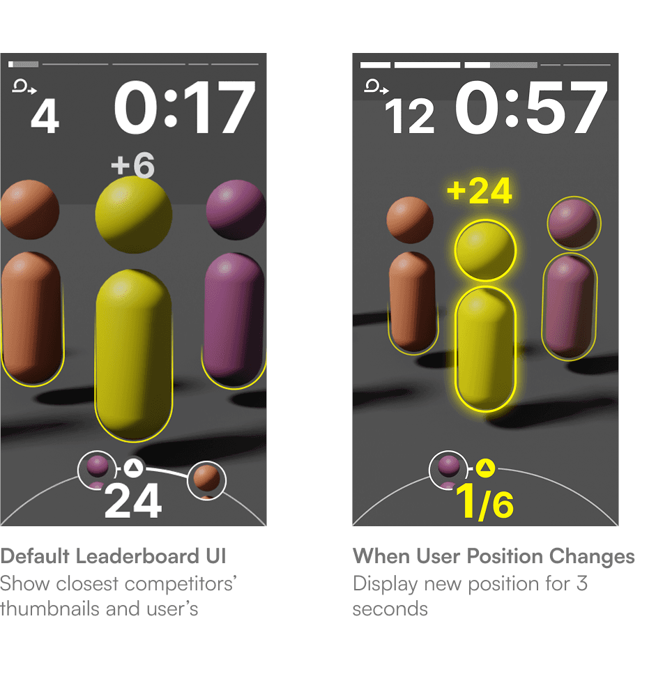 Shows only the rank directly above and below the user. Testing showed a full list created noise; only immediate competition drove motivation.