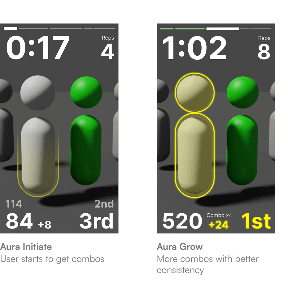 Embedded performance data into the user's tracked silhouette as a "Combo Aura." Readable through peripheral vision — no extra UI, no broken focus.