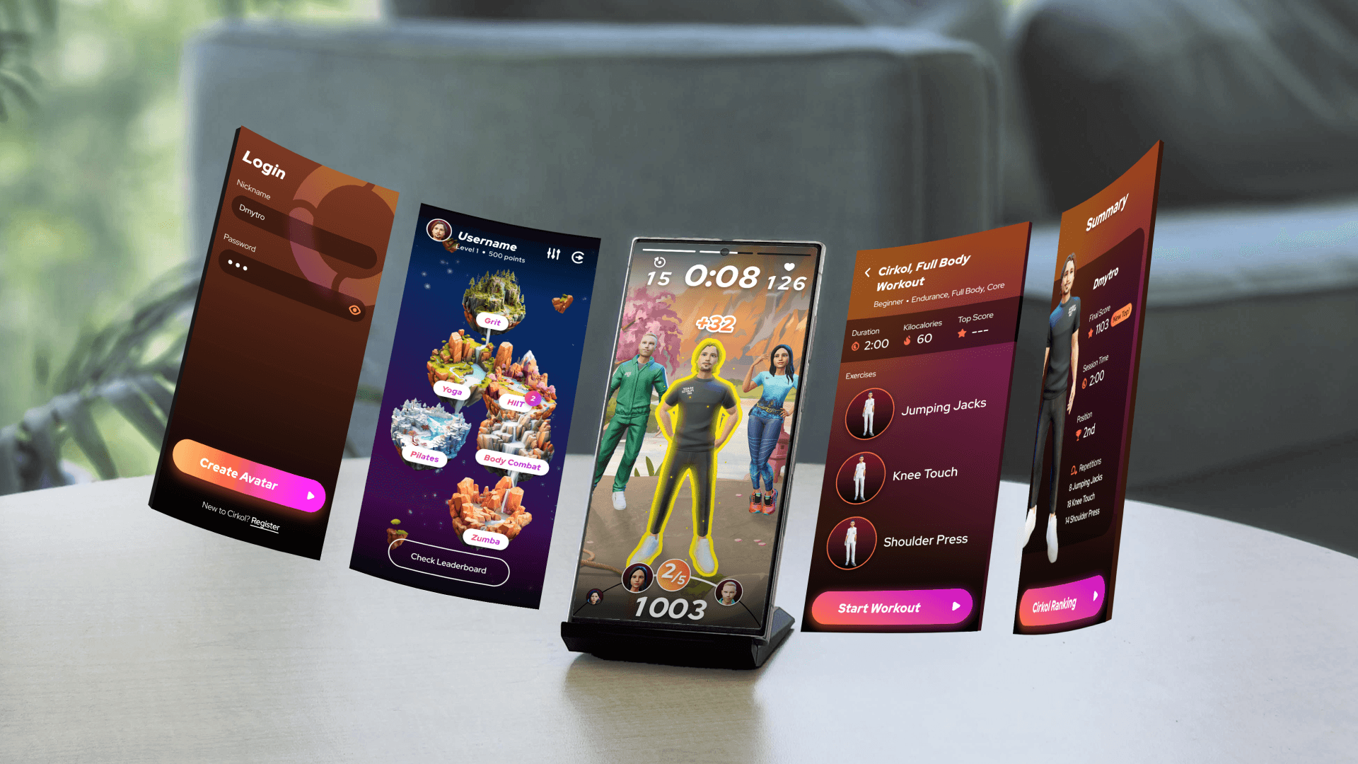Working out is hard to stick with. CIRKOL, a social fitness project incubated by Samsung Health, bridges the motivation gap by turning the smartphone into a motion sensor and a portal into a shared virtual world. As lead UX designer, I translated complex AI tracking data into an engaging experience that works across all fitness levels.
