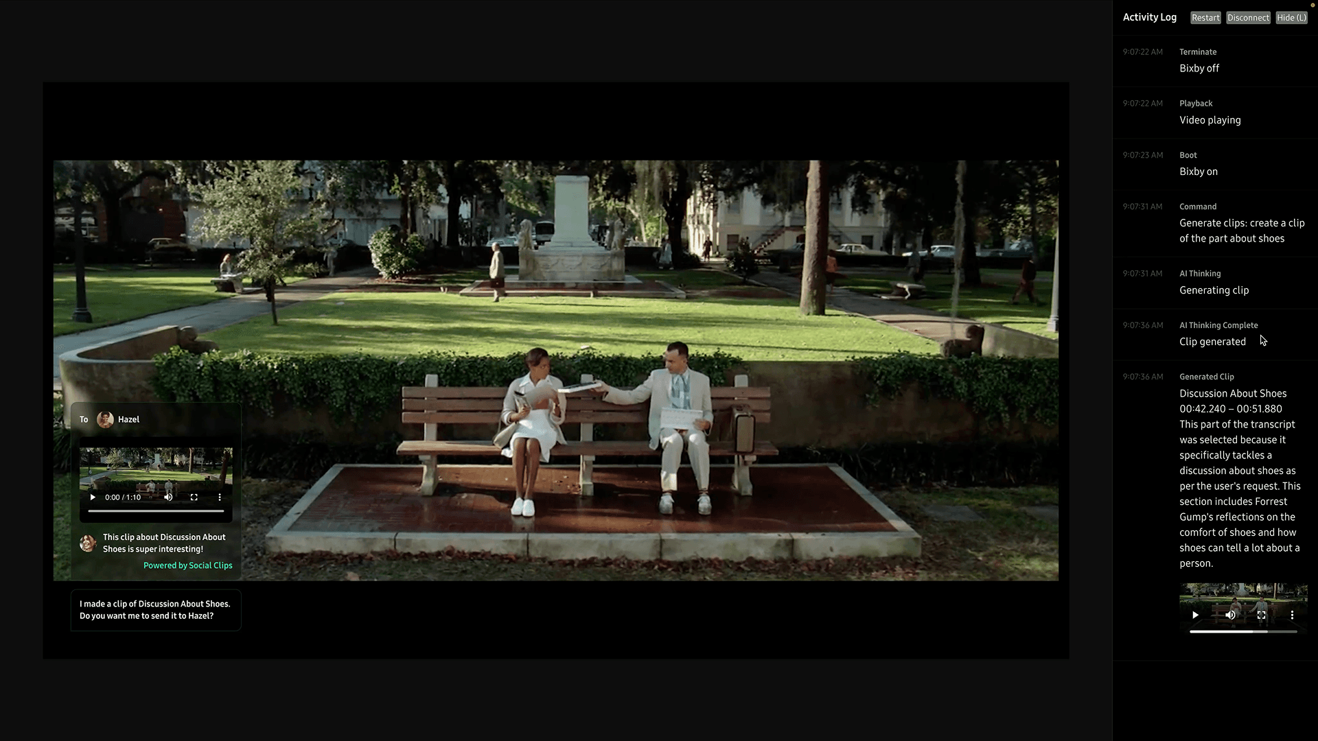 To address the input challenge, this prototype showed how voice could replace complex manual controls. A conversational request like "clip where he opens the box" lets the system identify and capture the exact scene — making sharing as natural as describing a moment to someone next to you.