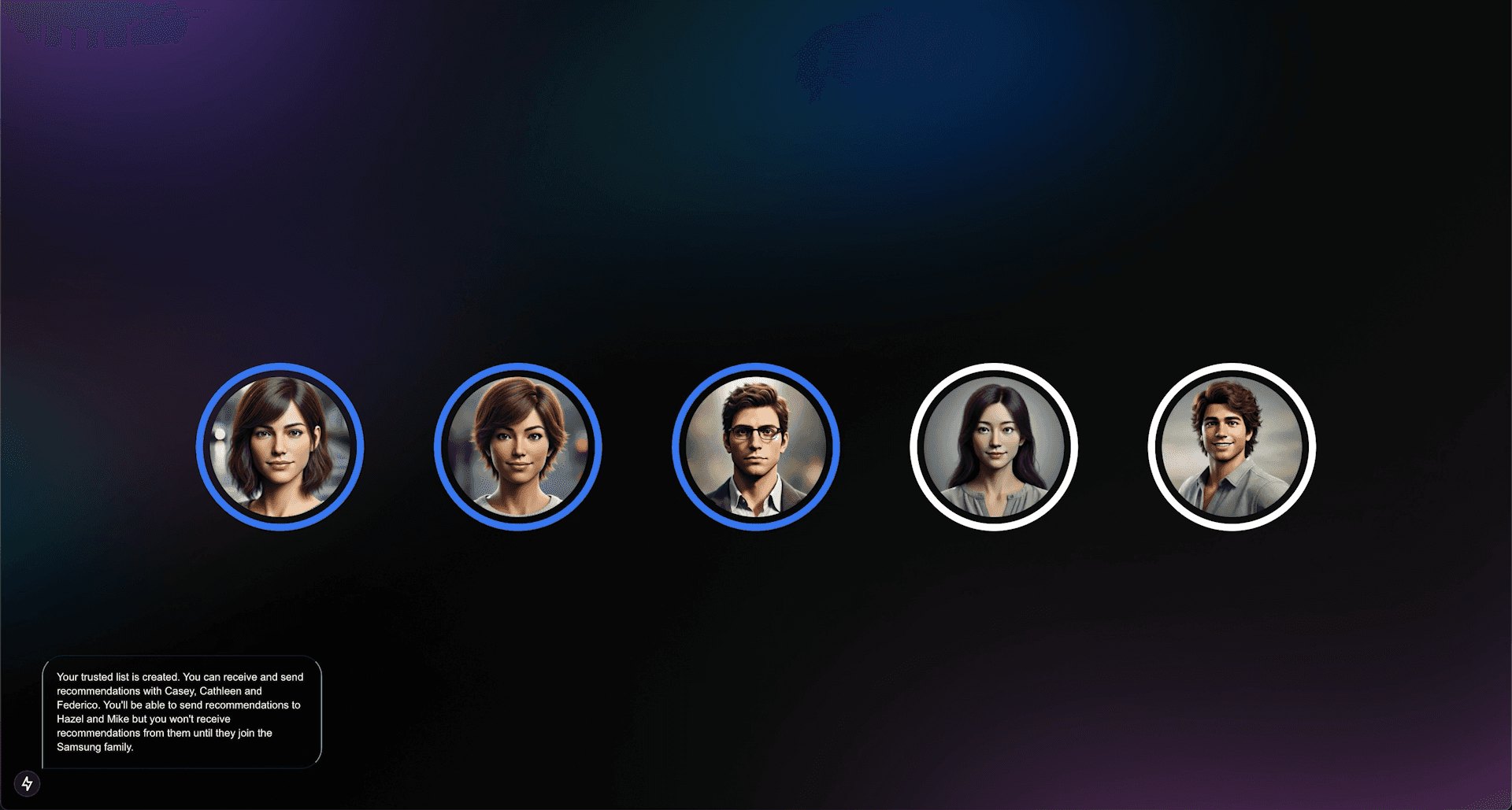 To address the identity challenge, this prototype demonstrated how users could build their social circle using natural language like nicknames and conversational phrasing, pulling directly from existing Samsung account data to prove real-world feasibility without friction.